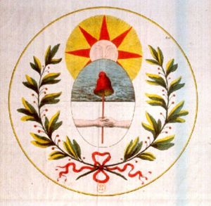 Escudo en un salvoconducto usado por miembros de un club revolucionario francés para acceder a la Asamblea Legislativa entre 1790 y 1793 El emblema del que se valían como laissez-passer (billete de salvoconducto) los miembros de un club revolucionario francés para acceder a la Asamblea Legislativa entre 1790 y 1793 tiene una clara similitud con el escudo argentino, salvo que tiene en el azul referencias marinas, en lugar de referencias celestes, y el sol no es el sol de mayo, de referencias incaicas. Aparece en una ilustración que figura en la obra La Revolución Francesa, de Michel Vovelle (Tomo 3° página 216). En la Biblioteca Nacional de Francia aparece como "Código de la Colección Qb.1 Año 1793". Posiblemente el diseño había sido obtenido por un argentino durante ese turbulento período o llevado por un jacobino que podría haber viajado para combatir por la independencia argentina (podemos recordar que Mme. Elisa Pichegru era una jacobina refugiada luego en el actual territorio argentino y amiga íntima de Manuel Belgrano). Lo concreto es que esa credencial era ya utilizada dos décadas antes de que la Asamblea General Constituyente de 1813 resolviese adoptar el conocido blasón nacional. Las iniciales "BR" que aparecen en un círculo bajo la cinta roja que une a los laureles significan "Bibliothèque Royale", razón por la cual también está incluida la corona real. Las letras "Lat" que se ven en el borde derecho del escudo, a la altura de los rayos segundo y tercero del sol, corresponden a la "Colección Latarrade" de la que formaba parte esa estampa y cuyo propietario del mismo nombre vendió una parte a la Biblioteca Nacional de Francia en 1841. A su vez, la familia de Latarrade, en 1863, donó a la misma institución otros quince mil grabados, de donde surge que la proveniencia del referido emblema está perfectamente certificada.