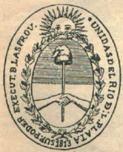 Escudo utilizado por la Asamblea del año XIII Se sabe que la Asamblea del año XIII, con el propósito de ejecutar actos soberanos, comisionó al diputado por San Luis, don Agustín Donado, que se encargara de la confección de un sello para autenticar los escritos del gobierno en reemplazo del utilizado hasta entonces con las armas reales de España, y que además serviría para acuñar la primera moneda nacional. Está también probado que Donado confió esa tarea al grabador cuzqueño radicado en Buenos Aires Juan de Dios Rivera y que, con el cuño por él tallado, fueron sellados algunos documentos emanados de la Asamblea; por último, en el Archivo General de la Nación figura el decreto del 12 de marzo de 1813, por el cual la Asamblea General Constituyente, con las firmas de su presidente, Tomás Valle, y el secretario Hipólito Vieytes, ordena "que el Supremo Poder Ejecutivo use el mismo sello de este Cuerpo Soberano, con la sola diferencia de que la inscripción del Círculo sea la de Supremo Poder Ejecutivo de las Provincias Unidas del Río de la Plata" . Con esa formalidad quedó registrada la fecha cierta de la creación de nuestro escudo, por más que "El Redactor de la Asamblea" publicara la noticia el día siguiente. A partir de ahí empiezan las divergencias acerca de quién fue realmente el autor del diseño respectivo. Ha sido atribuido al mismo Donado, al tallador Rivera, al artista peruano Isidro Antonio de Castro y a Bernardo de Monteagudo, entre otros, pero siempre haciendo la salvedad de que no existen constancias concluyentes que permitan sostener con total seguridad a quién de los nombrados cabe asignarle la paternidad del escudo. SimbolismoLa forma elíptica del cuerpo de este escudo (uno de los