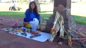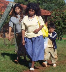 Mujer Guaraní vendiendo sus artesanías. Además de dedicarse a la agricultura, la caza y la pesca, los guaraníes eran grandes alfareros. Elaboraban vasijas, cántaros de diferentes formas y funciones, ollas, platos, etc. Los objetos eran decorados con impresiones realizadas con los dedos y con las uñas; otros más avanzados consistían en líneas y puntos rojos y negros sobre fondos blancos. Otra particularidad era que los objetos que se fabricaban no tenían asas. La vestimentaLos hombres prácticamente no usaban ropa, en cambio las mujeres usaban una especie de tapa sexo triangular de plumas o algodón tejido por ellas mismas. Desde la llegada de los misioneros los hombres comenzaron a utilizar un chiripá y una especie de taparrabos (baticolas) confeccionadas con la chala o hojas del maíz, fibra de ortiga o algodón; las mujeres comenzaron con el uso del typoi (túnica del algodón sin mangas, hasta los tobillos). Hombres y mujeres utilizaban adornos, tatuajes con pinturas fabricadas con la mezcla de especies vegetales, complementado con plumas de aves, amuletos colgados en el cuello, collares confeccionados con huesos de animales y semillas. Los distintivo entre varones y mujeres consistía en que los varones a partir de la pubertad llevaban una especie de clavo (de madera, hueso o piedra) ensartados debajo del labio inferior (tembetá) y las mujeres en las orejas. El ser guerrero, condición vitalEl pueblo guaraní poseyó desde un inicio, un carácter intrusivo en la región platense. Su entrada fue violenta y determinó una existencia constantemente ofensiva y defensiva respecto a las poblaciones aborígenes no guaraníes que habitaban la región. Los ataques se realizaban en forma masiva. Previo al ataque, se hacia caer sobre las fuerzas adversarias una lluvia de flechas y piedras. Luego venía la embestida directa con lanzas, macanas o garrotes. IdiomaEl idioma hablado por este pueblo era el guaraní, una lengua de la familia tupí-guaraní. El idioma se emplea hoy en toda la región anteriormente habitada por los guaraníes y es lengua oficial en el Paraguay y en la provincia de Corrientes en Argentina. La llegada de los jesuitasEn el siglo XV la sociedad guaraní pasó por un período de cambio. Comenzaron a aparecer instituciones unificadoras que probablemente, en el largo plazo, hubieran llevado al surgimiento de un Estado. Los karaí, profetas que eran aceptados en todas las tekuas (aldeas) que se enfrentaban entre sí en un permanente ciclo de búsqueda de poder para la obtención del Aguyé (véase la sección El canibalismo y el estado de Agujé), son un ejemplo de estas fuerzas unificadoras. Estos karaís recorrían las aldeas predicando el mensaje del advenimiento de importantes cambios; y no estaban adscritos a ninguna tekua en particular sino que eran panguaraníes, por así decirlo. Cien años después, con la invasión europea en la zona, llegan los jesuitas que en cierto sentido, vienen a competir directamente con los karaí. Aunque extranjeros, traen un mensaje unificador y sobre todo hay algo muy importante: los guaraníes que acepten su convivencia pasan automáticamente a estar cubiertos por las leyes del Rey de España. La expansión del frente hispano-portugués y la amenaza real que esto llevaba aparejado llevó a un debate interno entre los partidarios de la alianza con los jesuitas para así obtener la protección de la corona y los que preferían el enfrentamiento. Lo que hay que dejar en claro es que, la política guaraní obedecía a su propia lógica y en esa lógica los jesuitas fueron vistos como la pieza clave para obtener la protección del marco jurídico que la corona otorgaba. La alianza generalizada de los dirigentes políticos guaraníes con la orden jesuita obedeció a una estrategia global, debatida y consensuada por esos dirigentes, fruto de no pocos enfrentamientos internos, para frenar o al menos limitar el avance de la agresión de hacendados españoles y bandeirantes portugueses. (existen numerosas fuentes documentales de testigos que presenciaron estos debates de líderes políticos guaraníes; recomiendo la lectura del "Jardín de Flores paracuaria" del Padre Tadeo Xavier Hednis de la Orden Jesuita). Los jesuitas fueron utilizados por los guaraníes, para mantener su idea de la política. El modelo político guaraní ya tenía un lugar reservado para ser ocupado por los jesuitas (El Antiguo Karaí Pan Guaraní, no en vano a los Padres Jesuitas también les llamaron así: Karaís, incluso actualmente en guaraní correntino existe la palabra Karaí). Por ello se explica la rápida consecución de la alianza y el florecimiento de las Misiones. Las reducciones no eran más que tekuas o aldeas tradicionales que habían obtenido la protección de la corona, ingresando así no solo en el corpus legal sino también en una serie de intercambios económicos y culturales que se mantuvieron durante doscientos años. Los partidarios de la guerra se opusieron a esta alianza y permanecieron indómitos, en tekuas tradicionales (sin iglesias de piedra), advirtiendo una y otra a vez a los guaraníes "cristianos" que ese no era el camino. Como realmente sucedió, cuando la orden jesuita perdió la amistad del rey y fue expulsada y las reducciones arrasadas. Los guaraníes reducidos, los que habían apostado a la alianza con el invasor, se volvieron a la selva (por ejemplo los Ava Katu Ete). Pero el camino que tal vez hubiera llevado a la unificación ya se había roto. El escenario hacia principios del Siglo XIX era otro muy distinto y los diversos grupos se aislaron entre sí. Cabe destacar sin embargo que esta situación llevo a profundizar en aspectos prácticos de la religión o pensamiento filosófico guaraní, como la obtención del estado de perfección o Aguye por una nueva vía, no caníbal. Es notable la evolución del pensamiento guaraní con respecto a la obtención de energía por la vía caníbal. Es probable que la experiencia jesui