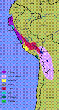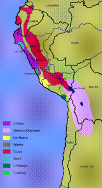 Imperio IncaEl Imperio Inca fue el estado prehispánico de mayor extensión en América, centrado en el actual Perú. Surgió a fines del siglo XII y en el momento de su mayor extensión, llegó a abarcar territorios desde el sur de Colombia, Ecuador, pasando por los Andes y el altiplano de Perú y Bolivia, hasta Chile y el noroeste de la Argentina. Dichos territorios fueron cuna de diversas culturas preincaicas que fueron conquistadas y anexadas al territorio imperial. Para una mejor organización política el Imperio Inca también llamado Tahuantinsuyo (que proviene de la frase quechua Tawantin Suyu (las cuatro regiones del Sol), estuvo conformado por cuatro suyus (quechua: suyu, 'territorio en quechua. Inti: (Sol), Tawa: (cuatro)' )?: