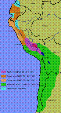 Mapa del Tahuantinsuyo: Chinchaysuyo (en rojo), Collasuyo (en azul), Antisuyo (en verde) y Contisuyo (en amarillo). Los cronistas afirmaron que el Tahuantinsuyu estuvo dividido en cuatro suyus o regiones principales: Chinchaysuyu, Antisuyu, Collasuyu y Contisuyu. El centro de esta división era el propio Cusco. Se ha atribuido al inca Pachacútec la creación de este sistema de organización del territorio; sin embargo sabemos que se trataba de una práctica que antecedió al gobierno de este gran reformador. Antes de consolidarse el dominio del inca en el Cusco, el espacio en torno de esta ciudad estuvo también dividido en cuatro partes. Las divisiones entonces correspondían a los territorios de los señoríos del área. Cuando Manco Cápac y sus clanes se establecieron en la zona, crearon los cuatro suyus incas a partir de esta división. Un tema que aún es motivo de discusión entre los investigadores es aquel de la extensión y los límites de cada suyu. Como hemos visto, la expansión inca se inició con Pachacútec, quién conquistó los curacazgos del área cercana al Cusco: los soras, lucanas y tambos. Otros líderes militares como su hermano Cápac Yupanqui, y posteriormente Túpac Yupanqui y Amaru Túpac, continuaron las conquistas, mientras Pachacútec permanecía en el Cusco. Por ejemplo, Cápac Yupanqui habría reconocido y visitado en la costa los valles de Chincha y Pisco, mientras que en la sierra central llegaría hasta Jauja. Túpac Inca continuó la conquista del Chinchaysuyu hasta la región de los cañaris (Tumibamba); mientras que Amaru Túpac y otros líderes militares conquistaron el Collasuyu hasta Chincha y el Contisuyu hasta Arequipa. Sin embargo, aún no sabemos si la franja costera entre Ica y Tarapacá fue conquistada en esta época o después, luego de que Túpac Yupanqui asumiera el mando supremo del Estado inca. Por otro lado durante los tiempos de Túpac Yupanqui la frontera norte se estableció cerca de Quito; mientras que la frontera sur se fijó en el río Maule, al sur de Santiago de Chile. Durante el gobierno de Huayna Cápac Se conquistaron nuevas regiones en el Ecuador y el sur de Colombia (Pasto). Estos son en general los límites conocidos del Tahuantinsuyu. El punto menos preciso es el relativo a la región amazónica, donde es difícil precisar los alcances que tuvieron las incursiones incas.