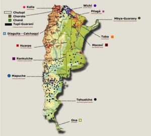 Mapa de pueblos indígenas en Argentina Las primeras tribus de cazadores de origen asiático llegaron a América a través del Estrecho de Bering hace unos 30.000 años aproximadamente, en tanto que su arribo al actual territorio argentino se considera producto de migraciones internas ocurridas hace 18.000 años. Estos pueblos se asentaron básicamente en dos regiones: la montaña y la llanura. Con respecto al primer hábitat, los testimonios más antiguos con que se cuenta son los rastros de núcleos poblacionales que datan de hace 8.000 años en Ayamapatín (Provincia de Córdoba) e Inti Huasi (Provincia de San Luis). Vestigios hay también de otra cultura antigua en Tafí (Provincia de Tucumán), de pueblos que trabajaban la piedra y la cerámica. Más reciente resulta la civilización de La Aguada (territorio comprendido por las provincias de San Juan, La Rioja y Catamarca), cuyos pobladores se dedicaban al cultivo del maíz y al trabajo en bronce y cuyo desarrollo se ubica entre los años 800 a 650. En cuanto a los asentamientos de llanura, se registra la presencia de un núcleo poblacional en Tandil (Provincia de Buenos Aires), de aproximadamente 6.000 años de antigüedad, cuyos habitantes trabajaban la piedra y la cerámica. En el Litoral, iguales vestigios dan cuenta de la llamada Cultura del Alto Paraná, de la misma data. En el extremo sur y los canales fueguinos se considera la llegada de los primeros hombres hace 6.000 años, los que habitaban en viviendas circulares semienterradas, vivían de la caza y la pesca, empleaban botes y arpones para la caza de mamíferos marinos y recolectaban moluscos. Con la llegada de los conquistadores españoles los pueblos indígenas vieron truncadas sus posibilidades de desarrollo cultural. NoroesteExistieron cinco culturas indígenas en la región: diaguitas, omaguacas (humahuacas), atacamas, chiriguanos y lule–vilelas. La cultura diaguito–calchaquí es la más representativa de los antiguos habitantes indígenas del Noroeste argentino y conforma la más compleja y numerosa de las poblaciones. Este grupo está integrado por tres entidades distintas, que se suelen conocer como: pulares, en el Valle de Salta; calchaquíes, en los valles de Calchaquí y Yocavil —Salta–, en Tucumán y Catamarca; y diaguitas, en zonas de La Rioja. Sus componentes eran racialmente andinos. Todas ellas tenían en común la lengua “caca” o “cacán”. Se trataba de una cultura de agricultores sedentarios, poseedores de irrigación artificial por medio de canales y con andenes de cultivo para sus productos principales: maíz, zapallo y porotos. Fueron criadores de llamas, de las cuales emplearon su lana para tejidos y para carga. La recolección fue otra de sus actividades, especialmente de la algarroba y el chañar, que almacenaban en grandes cantidades. Tenían fuertes jefaturas, probablemente hereditarias, que llegaban a desplegar su autoridad sobre varias comunidades. La familia monogámica era el núcleo vital de la comunidad, destacándose la práctica de la poligamia entre los caciques. Eran adoradores del sol, el trueno y el relámpago. Celebraban rituales propiciatorios de la fertilidad de los campos y tenían una funebria elaborada, expresión de un culto a los muertos como tránsito crucial en el ciclo de vida de la cultura. Su arte, dirigido muchas veces a lo religioso, es el más acabado de nuestras culturas indígenas. No sólo en cerámica sino también en metalurgia. La cultura diaguita opuso una feroz resistencia a la conquista española durante las Guerras Calchaquíes que se extendieron por más de 100 años. El instrumental bélico era muy variado y la guerra contra el español asumió las características de un fenómeno integral en el que participó la comunidad entera. Aproximadamente unos 200.000 indígenas conformaban este pueblo a la llegada de los españoles. Región del Litoral y MesopotamiaLos káingang (hombres del bosque): Este grupo humano fue el que encontraron los conquistadores a su llegada a la Mesopotamia. Al poco tiempo este grupo desapareció como entidad étnica al ser absorbida por los charrúas y los guaraníes. Su organización económica estaba basada en la recolección, la caza y la pesca. Utilizaban como vivienda paravientos de vegetal trenzado, que se unían para formar chozas de dos aguas, sin paredes. Grupos de estas construcciones formaban las poblaciones que eran gobernadas por un cacique. Los guaraníes (guerreros): Más allá de la dificultad que aún hoy representa determinar con precisión el origen del pueblo guaraní, es importante destacar la trascendencia que culturalmente tuvo en el territorio misionero y la región. Vivían en aldeas, en los claros que formaba naturalmente la selva y constituyendo una verdadera unidad tribal por ser entidades económicas independientes una de otra y por lo tanto, autosuficientes. La costumbre generalizada, practicada por los demás integrantes de la comunidad tribal era la monogamia. Las uniones no eran muy estables, por ello el divorcio era común. Los guaraníes eran básicamente agricultores, las familias poseían un lote exclusivo en las plantaciones comunitarias y a su vez cada esposa tenía una huerta personal. Es un pueblo profundamente religioso, con alto grado de espiritualidad. El “shamán” o “payé” posee poderes sobrenaturales y desempeña una función directriz –conductor de su pueblo en todos los actos comunitarios–. En el sitio web de la Provincia de Misiones se pueden encontrar antecedentes de ésos y otros grupos étnicos de la región. Región Serrana y CuyoEsta zona fue habitada por los comechingones, los sanavirones, los pehuenches y los puelches. Los comechingones recibieron tal denominación por parte de los conquistadores españoles, quienes entendían que dicha palabra aludía a un grito de guerra. Habitaban el cordón montañoso ubicado entre las provincias de Córdoba y San Luis. Formaban pequeños grupos independientes,
