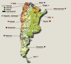 Mapa de pueblos indígenas en Argentina El poblamiento humano del actual territorio de Argentina tiene una antigüedad de entre 10.100 y 13.000 años AP, de acuerdo a los hallazgos de Piedra Museo, en la región patagónica.[1]. Con posterioridad se conformaron tres regiones muy marcadas: en el cuadrante del noroeste andino se establecieron culturas agroalfareras emparentadas con la Civilización andina y una parte de ellas llegó a integrar el Imperio Inca; en el cuadrante nordeste se establecieron culturas agroalfareras emparentadas con la familia tupí-guaraní; en el cono sur de la pampa y la Patagonia se establecieron culturas nómades. Durante la conquista europea las culturas indígenas que habitaban el actual territorio argentino corrieron suerte diversa. Por un lado las culturas pampeanas y patagónicas así como las que habitaban el Gran Chaco resistieron exitosamente la conquista española y nunca estuvieron bajo dominación colonial. En el cuadrante noroeste la colonización española estableció sus principales centros de población y producción sobre la base de trabajo encomendado de los indígenas, en tanto que las naciones indígenas protagonizaron grandes guerras e insurrecciones contra los españoles. El cuadrante noreste se caracterizó por el establecimiento de las Misiones Jesuíticas de los pueblos guaraníes que conformaron un tipo completamente original de sociedad indígena-cristiana autónomas de la Monarquía Hispánica que se enfrentaron incluso a las tropas conjuntas de España y Portugal en la llamada Guerra Guaranítica, y que fueron finalmente disueltas por la Corona Española en 1767. Todas las naciones indígenas sufrieron también el colapso demográfico que afectó a todos los pueblos indígenas americanos, y que fue en gran medida consecuencia de las enfermedades introducidas por los europeos. Una vez constituída como nación independiente las Provincias Unidas de Sud América, primero y su continuadora la República Argentina, después, iniciaron un proceso de conquista de los territorios ocupados por los pueblos originarios que no habían sido dominados por el Imperio Español, especialmente en la pampa, la Patagonia y el Gran Chaco. Estas guerras contra el indio, tuvieron su punto más alto en la llamada Conquista del Desierto de 1880 en la que fueron derrotadas las naciones Mapuche, Het y Ranquel, y le permitieron a la Argentina triplicar su territorio y expandirlo hacia el norte y hacia el sur. La Encuesta Complementaria de Pueblos Indígenas (ECPI) realizada en 2004-2005 detectó la existencia de 35 pueblos indígenas en la Argentina, integrados por poco más de 400 mil personas, equivalente al 1,1% de la población total[2]. Ello sin perjuicio de que poco más de la mitad de la población tiene al menos un antepasado indígena, aunque en la mayoría de los casos se ha perdido la memoria familiar de esa pertenencia. Todas las culturas indígenas han sido afectadas por un proceso deliberado de invisibilización, promovido desde el Estado, desde la segunda mitad del siglo XIX[3]. HistoriaEn el actual territorio argentino vivieron y se establecieron varias culturas indígenas con diferentes evoluciones, que irían confluyendo en tres grandes áreas sin límites claros: la llanura pampeana y la Patagonia, donde no parece haberse desarrollado culturas agroalfareras; la zona central y noroeste andina, donde aparecieron varias culturas agroalfareras de tipo andino basadas en el maíz y la papa, incluso con ciudades, ligadas; y la zona del litoral mesopotámico, donde llegaron a desarrollarse culturas agroalfareras fundadas en la yuca, de carácter diferente a las andinas, con culturas de gestión de la selva y el medio ambiente [4]. La pampa y la PatagoniaLa presencia humana más antigua en territorio argentino ha sido registrada en la Patagonia (Piedra Museo, 13.000 años adP[1]), aparentemente relacionada también con la posible presencia humana mucho más antigua aún detectada en el sur chileno (Monte Verde, 33.000 años adP[5]). Estos descubrimientos no solo han puesto en crisis la teoría del poblamiento tardío y la llegada por Beringia, sino que sugieren una corriente pobladora de entrada al actual territorio argentino a través de la Patagonia y el extremo sur chileno. Otro remoto asentamiento fue ubicado en Los Toldos, también en la provincia de (Santa Cruz) con restos que datan de 10.500 años adC. Hace 9.000 años surgió la industria Toldense, caracterizada por puntas de proyectil sub-triangulares bifaciales y raspadores laterales y terminales, cuchillos bifaciales y herramientas de hueso. Estos primeros habitantes del territorio argentino cazaban milodones (parecido a un gran oso con cabeza de camello ya extinguido) e hippidions (caballos sudamericanos que desaparecieron hace 10.000 años), además de guanacos, llamas y ñandúes.