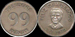 Moneda no oficial distribuida en 1996 con motivo del cumpleaños número 66 del entonces Presidente. Si se invertía la misma, podía leerse "Presidente 99", en alusión a la segunda reelección a la que aspiraba el mandatario Después de asumir su mandato como presidente, y durante el ejercicio del mismo, Menem dedicó especial atención a los medios de difusión, profundizando así su protagonismo público y su perfil mediático. Esa actitud le valió duras críticas, enfocadas en algunos casos en errores notorios que lo hicieron aparecer como una persona con una cultura incompleta o deficiente. Según algunos medios periodísticos ("Clarín" y Página/12), en oportunidad de brindar una conferencia de prensa, Carlos Menem habría afirmado que entre sus lecturas se hallaba una obra escrita por Sócrates. Obviamente, el error de Menem habría consistido en que, aunque se desconoce si el filósofo ateniense existió o es en realidad una creación literaria de Platón, lo cierto es que jamás empuñó la pluma para difundir sus enseñanzas. En otra ocasión, dando comienzo al ciclo lectivo de 1996 en Tartagal (Salta), informó a los niños de una humilde escuelita en el empobrecido Norte argentino que se licitaría un sistema de vuelos estratosféricos "desde una plataforma que quizás se instale en la provincia de Córdoba. Esas naves espaciales van a salir de la atmósfera, van a remontar a la estratósfera y desde ahí elegir el lugar donde quieran ir de tal forma que en una hora y media podamos, desde Argentina, estar en Japón, en Corea o en cualquier parte" ("La Nación")(video ) Otro proyecto impulsado por Menem y duramente criticado por la prensa fue el de construir una Aeroisla, una isla artificial en el Río de la Plata a la cual sería trasladado el Aeroparque Jorge Newbery. El proyecto, apoyado por Álvaro Alsogaray, nunca prosperó ("Clarín"). |