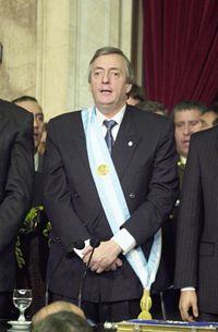 Néstor Carlos Kirchner (nacido el 25 de febrero de 1950) es el presidente de la Nación Argentina desde el día 25 de mayo de 2003. Es un peronista identificado con el ideario histórico impulsado por Juan Perón y Eva Duarte ("Evita"), ideario que fuera abandonado por el anterior presidente peronista, Carlos Menem. Antes de ser electo presidente fue gobernador de la provincia de Santa Cruz. Primeros tiemposKirchner nació en Río Gallegos, capital de la patagónica provincia de Santa Cruz. Su padre, Néstor Kirchner, era un trabajador postal descendiente de inmigrantes suizos; su madre, María Ostoić, chilena descendiente de inmigrantes croatas, nació en Punta Arenas. Realizó sus estudios primarios y secundarios en escuelas públicas locales. Egresó del Colegio Nacional República de Guatemala. Tempranamente Kirchner participó en el movimiento justicialista como miembro de la Juventud Peronista, un sector juvenil de izquierda radicalmente opuesto a la dictadura militar de 1966-1973. A principios de la década del setenta, Kirchner estudió Derecho en la Universidad Nacional de La Plata, recibiendo su diploma de abogado en 1976. En 1974, como parte de su formación y a las órdenes del director Héctor Olivera, actuó como extra en el exitoso largometraje "La Patagonia Rebelde"[1]. En 1976, luego del golpe del 24 de marzo, junto con su esposa, Cristina Fernández, abandonó La Plata para retornar a Río Gallegos para dedicarse a ejercer su profesión, alejado de la política. Durante la dictadura militar de Videla fue puesto en prisión en dos oportunidades (se desconocen las razones). Una vez terminado el gobierno militar y con el retorno de la democracia en 1983, Kirchner se convirtió en funcionario del gobierno provincial. Desde fines de 1983 hasta julio de 1984 fue presidente de la Caja de Previsión Social de la provincia, pero fue forzado a renunciar por el gobernador a causa de una disputa sobre política financiera. Este incidente lo hizo conocido en el ámbito local, y constituyó el paso inicial de su carrera política. En 1986 había alcanzado el apoyo interno necesario para obtener la candidatura a intendente municipal (alcalde) de la ciudad de Río Gallegos. Triunfó por escaso margen en las elecciones del 6 de septiembre de 1987, asumiendo el cargo el 10 de diciembre siguiente. Al mismo tiempo, su compañero de partido Ricardo del Val era electo gobernador, con lo que el peronismo se afianzó firmemente en la provincia de Santa Cruz. La gestión de Kirchner como intendente desde 1987 a 1991 le granjeó suficiente apoyo para ser electo gobernador de la provincia en 1991, con el 61% de los votos. Por ese tiempo su esposa ya era miembro del congreso provincial. Gobernador de Santa CruzExisten desacuerdos sobre la neutralidad en el punto de vista de la versión actual de esta sección. En la página de discusión puedes consultar el debate al respecto. Cuando Kirchner asumió la gobernación, la provincia de Santa Cruz contribuía con sólo el 1 % del PIB nacional, principalmente en la producción de materias primas (mayormente petróleo), y enfrentaba una grave crisis económica, con elevados niveles de desempleo y un déficit fiscal de 1.200 millones de dólares. Sus políticas se centraron en la realización de inversiones para estimular la actividad productiva, el empleo y el consumo. Recortando el gasto público y aprovechando las regalías de la industria petrolera, Kirchner logró restaurar el equilibrio de las cuentas provinciales. La provincia alcanzó razonables niveles de crecimiento económico, lo que fue facilitado por la escala relativamente pequeña de la base económica y del mercado de trabajo de su provincia. Sus críticos señalan que su gestión no fue diferente a la de la mayor parte de los gobernadores peronistas, y que siguió los lineamientos nacionales de las políticas impulsadas por Menem, basándose en el personalismo y el autoritarismo, manteniendo control sobre la prensa local y nombrando como jueces de la Corte Suprema provincial a personas de su confianza. El uso discrecional del empleo público y una economía fuertemente subsidiada, llevó al desarrollo del clientelismo político en la provincia. En 1994 y en 1998, Kirchner impulsó reformas en la constitución provincial, que incluyeron la posibilidad de reelección indefinida del gobernador. En 1994 fue miembro de la Convención Constituyente que reformó la Constitución Argentina. Ver Reforma de la Constitución Argentina de 1994 En 1995, con las reformas a la Constitución provincial ya en vigencia, Kirchner fue reelecto gobernador por amplio margen (66,5% de los votos). A partir de ese momento Kirchner se distanció de Menem (que además de presidente de la Nación era el líder del Partido Justicialista) lanzando una línea interna dentro del partido, llamada “Corriente Peronista”. El intento de Menem en 1998 de presentarse a una re-elección, con base en una interpretación ad hoc del texto constitucional, generó fuerte oposición en la sociedad argentina, en ámbitos académicos y aún dentro de las filas del Partido Justicialista. Kirchner se alió con el principal opositor de Menem dentro del Partido Justicialista, el gobernador de la Provincia de Buenos Aires (y más tarde presidente) Eduardo Duhalde. Gobiernos anteriores: De La Rúa y DuhaldeEn las elecciones del 24 de octubre de 1999 fueron electos presidente Fernando de la Rúa junto a Carlos "Chacho" Alvarez, candidatos de la Alianza (un conglomerado de fuerzas del centro y de la izquierda moderada, encabezado por la Unión Cívica Radical) aliados al FREPASO. El justicialismo se mantuvo como primera minoría en la Cámara de Diputados y como mayoría en el Senado. El candidato presidencial del Justicialismo en esa elección fue el Dr. Eduardo Duhalde. Durante la campaña electoral, De La Rúa propuso mantenerla estabilidad monetaria y cambiaria y la Alianza hizo hincapie en mejorar aspectos sociales, educativos y de