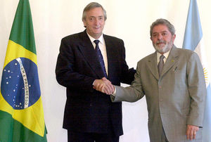Néstor Kirchner y su par estadounidense George W. (enero de 2004) A nivel internacional, sus adherentes insisten en que Kirchner forma parte de un grupo de mandatarios de varios países, junto con Lula (Brasil), Tabaré Vázquez (Uruguay), Evo Morales (Bolivia), Michelle Bachelet (Chile), Rafael Correa (Ecuador) y Hugo Chávez (Venezuela) quienes, por primera vez en la historia de América Latina, han planteado la posibilidad de establecer una coalición de países de la región que desarrolle políticas independientes de las potencias mundiales hegemónicas[2]. En cambio, para las posiciones más de izquierda, estos jefes de estado -con la eventual excepción de Chávez, Morales y Correa-, han mantenido las relaciones con el gobierno estadounidense sin cambios esenciales. La participación argentina en la MINUSTAH se realizó por pedido directo del gobierno estadounidense, y el gobierno argentino sigue permitiendo ejercicios militares conjuntos con las fuerzas armadas estadounidenses en territorio argentino. Asimismo, en marzo de 2006 ha aprobado una batería de leyes con el fin de sumarse a la "lucha contra el terrorismo" propugnada por el presidente estadounidense George W. Bush, quien había sido felicitado por su colega Kirchner en la reelección del primero en noviembre de 2004. Durante el año 2005, se realizó el canje de la deuda, que iniciaba las renegociaciones por los bonos que habían quedado en default desde 2001. Su agrupación política, el Frente para la Victoria, triunfó, liderado por su esposa, en las elecciones legislativas de dicho año. En los primeros días de noviembre de ese año se realizó en Mar del Plata la IV Cumbre de las Américas, donde Kirchner manifestó un rechazo hacia el ALCA, propuesto por Estados Unidos. A fines de ese mes Roberto Lavagna renunció al cargo de ministro de Economía, sucediéndole Felisa Miceli.
