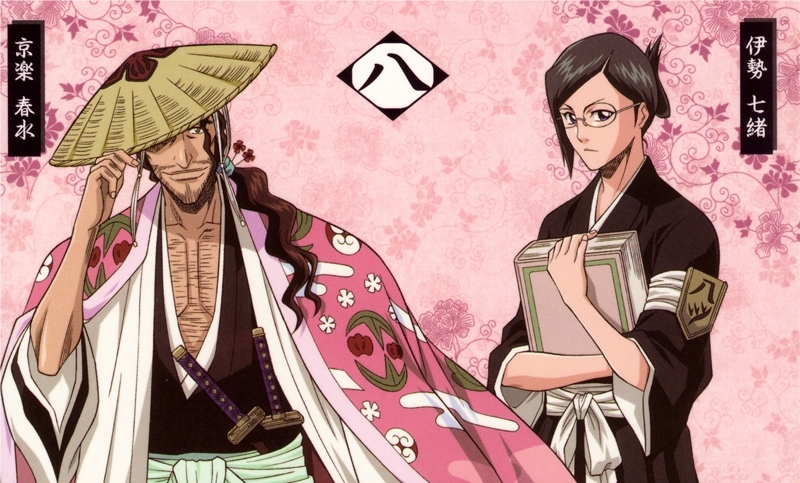 Shunsui Kyoraku: Preguiçoso e folgado, deixa a maior parte das tarefas do esquadrão por conta de sua tenente e prefere dormir ou sair para beber. Não gosta de lutas e tenta evitá-las ao máximo. Segundo filho da família Kyouraku, Shunsui sempre teve um fraco por mulheres e bebidas, preferindo correr atrás das moças e bares a estudar e treinar. Apesar disso, era maduro e perceptivo para a idade, então foi mandado, contra sua vontade, para a Academia Shinigami, onde virou amigo de Ukitake Juushirou, sendo ambos treinados pelo Comandante Yamamoto, e os primeiros alunos formados pela Academia a virar capitães do Gotei 13.