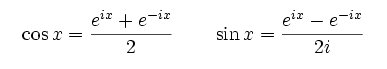 Esta relación puede probarse usando el desarrollo en serie de Taylor para la función exponencial y el obtenido en la sección anterior para las funciones seno y coseno. Separando ahora en parte real e imaginaria en la expresión anterior se encuentran las definiciones de seno y coseno en términos de exponenciales complejas: