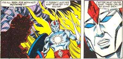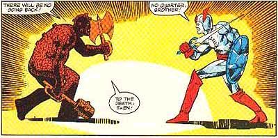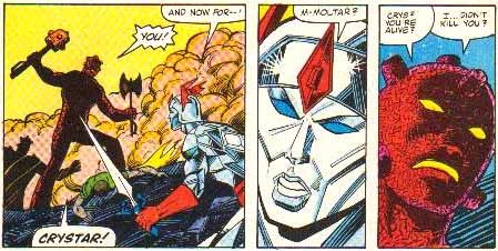 �brigens, f�r den Fall, dass du dich wunderst, die Comicseite da oben ist aus THE SAGA OF CRYSTAR, CRYSTAL WARRIOR #1, dem ersten Heft von 11, die ein Tie-In zu einer Spielzeugfigurenserie waren, die man vergessen kann, die in den fr�hen Achtzigern erschien. Es ist ein pr�chtiges Beispiel von klischeebehaftetem Schreiben, mit � nach meiner Z�hlung � wenigstens acht Beispielen dieses Krams auf der Seite allein, dazu kommt die Tatsache, dass die zwei Figuren sich befehdende Br�der sind. Man erwartet fast, dass eine Hure mit einem Herz aus Gold an irgendeinem Punkt vorbeikommt, nicht wahr? ... ;-)