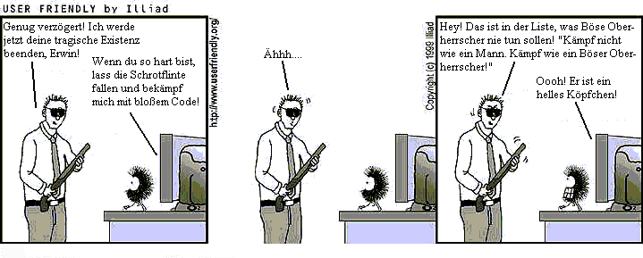 �K�mpfe nicht wie ein Mann! K�mpfe wie ein b�ser Oberherrscher!��bersetzt von Ulf B�hnke1. Meine Legionen des Schreckens werden Helme mit klaren Plexiglasvisieren tragen, die ihre Gesichter nicht verdecken. 2. Meine Bel�ftungssch�chte werden zu klein sein zum Durchkriechen. 3. Mein nobler Halbbruder, dessen Thron ich gestohlen habe, wird get�tet und nicht anonym in einer abgelegenen Zelle meines Kerkers eingesperrt. 4. Erschie�en ist nicht zu gut f�r meine Feinde. 5. Das Artefakt, das die Quelle meiner Macht ist, wird nicht versteckt auf dem Berg der Verzweiflung, hinter dem Fluss des Feuers, bewacht vom Drachen der Ewigkeit. Es kommt in meinem Tresor. Das gleiche gilt f�r das Objekt, das meine einzige Schw�che ist. 6. Ich genie�e nicht das Schicksal meiner Feinde, bevor ich sie t�te. 7. Habe ich meinen Gegner gefangen und er sagt: �Bevor du mich t�test, wirst du mir wenigstens sagen, worum es hier geht?� sage ich �Nein� und erschie�e ihn. Nein, nach nochmaligen Nachdenken: Ich erschie�e ihn erst und sage dann �Nein�. 8. Nachdem ich die wundersch�ne Prinzessin gefangen habe, heiraten wir auf der Stelle in einer ruhigen, b�rgerlichen Zeremonie. Nicht erst in drei Wochen bei einem opulenten Spektakel, w�hrend der Ausf�hrung der letzten Phase meines Plans. 9. Ich baue keinen Selbstzerst�rungsmechanismus ein, es sei denn, er ist absolut notwendig. Ist er absolut notwendig, ist er kein roter Knopf mit der Aufschrift �Gefahr: Nicht Dr�cken�. Der rote Knopf mit der Aufschrift �Gefahr: Nicht Dr�cken� l�st stattdessen einen Kugelhagel aus, der die Person trifft, die dumm genug war, die Warnung zu missachten. �hnlich wird der EIN/AUS-Schalter nicht richtig beschriftet sein. 10. Ich befrage meine Feinde nicht in meinem innersten Bollwerk � das geht genauso gut in einem kleinen Hotel gleich au�erhalb meiner Grenzen. 11. Ich bin mir meiner �berlegenheit sicher. Daher versp�re ich nicht den Drang, sie zu beweisen. Also lasse ich keine Hinweise in Form von R�tseln zur�ck und lasse auch schw�chere Feinde nicht am Leben, um zu zeigen, dass sie keine Bedrohung darstellen. 12. Einer meiner Ratgeber ist ein durchschnittliches, f�nf Jahre altes Kind. Jede Schw�che meiner Pl�ne, das es erkennen kann, wird vor der Ausf�hrung korrigiert. 13. Alle erschlagenen Feinde werden verbrannt, oder man feuert wenigstens mehrere Salven Munition in ihre Leichen. Sie werden nicht am Boden der Klippe gelassen, weil man sie f�r tot h�lt. Die Ank�ndigung ihres Todes, ebenso wie jegliche begleitende Feier, wird bis zur erw�hnten Behandlung verschoben. 14. Der Held hat kein Anrecht auf einen letzten Kuss, eine letzte Zigarette oder eine andere letzte Bitte. 15. Ich benutze niemals eine Vorrichtung mit einem digitalen Countdown. Meine ich, dass eine solche Apparatur absolut unvermeidlich ist, stelle ich sie so ein, dass sie sich aktiviert, sobald der Z�hler 117 erreicht und der Held gerade seinen Plan in die Tat umsetzen will. 16. Ich sage nie: �Aber bevor ich dich t�te, gibt es noch etwas, was ich wissen will.� 17. Stelle ich Ratgeber ein, h�re ich gelegentlich auf ihren Rat. 18. Ich zeuge keinen Sohn. Obwohl sein lachhaft schlecht geplanter Versuch die Macht an sich zu rei�en, schnell scheitert, stellt er eine t�dliche Ablenkung w�hrend eines wichtigen Zeitpunkts dar. 19. Ich zeuge keine Tochter. Sie w�re ebenso sch�n wie t�dlich, aber ein Blick auf das zerlumpte Aussehen des Helden und sie betr�gt ihren eigenen Vater. 20. Trotz des nachgewiesenen, stressabbauenden Effekts breche ich nicht in manisches Gel�chter aus. Man verpasst allzu leicht unerwartete Entwicklungen, auf die sich eine aufmerksamere Person einstellen k�nnte. 21. Ich stelle einen talentierten Mode-Designer ein, um neue, originelle Uniformen f�r meine Legionen des Schreckens zu erschaffen - im Gegensatz zu billigen Nachahmungen, die sie wie Nazi-Truppen, r�mische Fu�soldaten oder wilde Mongolenhorden aussehen lassen. Alle wurden am Ende besiegt und ich will eine positivere Einstellung meiner Truppen. 22. Egal, wie sehr ich durch die Aussicht auf unbegrenzte Macht versucht bin, ich verschlucke niemals ein Energiefeld, das gr��er als mein Kopf ist. 23. Ich habe ein Extralager f�r primitive Waffen und unterrichte meine Truppen in ihrem Gebrauch. Sogar wenn die Helden es schaffen sollten, meinen Kraftgenerator zu neutralisieren und/oder die Standardausgabe meiner Energiewaffen nutzlos zu machen, werden meine Truppen dann nicht von einer Handvoll mit Speeren und Steinen bewaffneten Wilden �berrannt. 24. Ich halte eine realistische Abmessung meiner St�rken und Schw�chen immer auf dem neuesten Stand. Auch wenn das der Arbeit etwas von ihrem Spa� nimmt, sage ich wenigstens nie: �Nein, das kann nicht sein! ICH BIN UNBESIEGBAR!!!� Danach tritt der Tod f�r gew�hnlich auf der Stelle ein. 25. Egal wie gut sie funktionieren w�rde, ich baue niemals irgendeine Art von Maschinerie, die vollst�ndig unzerst�rbar ist, bis auf einen kleinen und fast unzug�nglichen, verletzlichen Teil. 26. Egal wie gutaussehend gewisse Mitglieder der Rebellion sind, es gibt wahrscheinlich eine Person, die ebenso attraktiv ist, aber nicht so verzweifelt darauf aus ist, mich zu t�ten. Daher denke ich zweimal dar�ber nach, bevor ich eine gefangene Person in meine Bettkammer befehle. 27. Ich baue niemals nur ein Exemplar von etwas wichtigem. Alle wichtigen Systeme haben einander gleichrangige Kontrollen und Stromerzeuger. Aus demselben Grund trage ich zu jeder Zeit wenigstens zwei vollgeladene Waffen. 28. Mein Hausmonster wird in einem sicheren K�fig gehalten, aus dem es nicht entkommen kann und in den ich nicht hineinstolpern kann. 29. Ich trage helle und fr�hliche Farben und st�rze so meine Feinde in Verwirrung. 30. Alle ungeschickten Zauberer, plumpen Waffentr�ger, untalentierten Barden und feigen Diebe werden pr�ventiv 