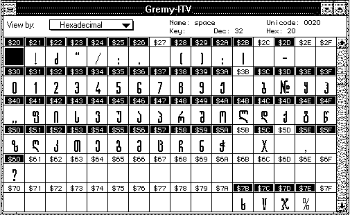 Font "Gremi" - typical uppercase (capital) letter set. HEX encoding view