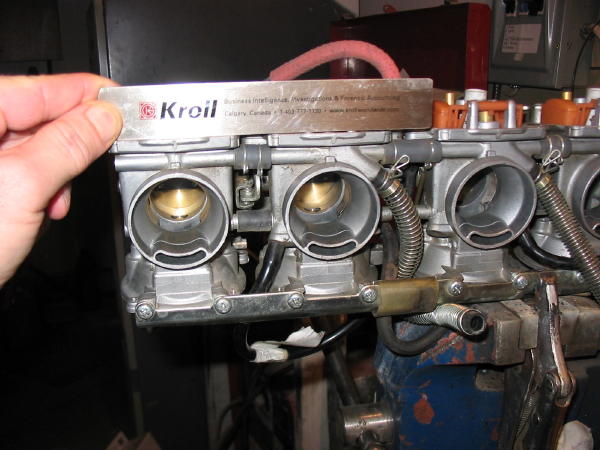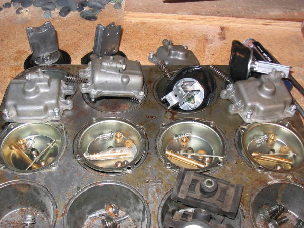 The service manual recommends a total disassembly of the carburetors for service and in fact this is not necessary for most work, they can remain together, coupled with the set plates top and bottom. Matter of fact in the attached photo you will see that the carb's as a group can be managed conveniently by using vice grip pliers on the set plate to hold the rack stable for performing work on them.