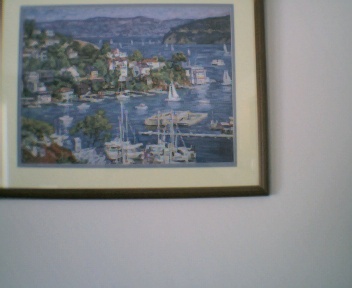 Anyway, the south wall is the only real space to hang anything right now. I have a relatively large print I purchased at the Ann Arbor art fair (yes I know there are several--four?--separate ones). It hangs over the stereo stand which in turn is flanked by book shelves. One has a sailing ship on it and the other has an old fashioned mantle clock on it. The actual print is of San Francisco Bay and was painted by someone named Kaspin. I really like the colors: