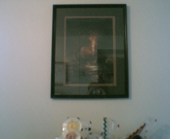 Directly in front is a print I purchased from the United States Naval Institute. It is a print of a 1897 painting by Edwin Moran showing the burning of the USS Philadelphia in Tripoli harbor during the Tripolitan War. Captured by the enemy, US forces entered the harbor, boarded the ship and set it afire, and escaped. The successful operation redeemed our reputation after the disaster of losing the frigate in the first place. With the overhead light illuminating the flames in an otherwise dark painting, it looks quite striking: