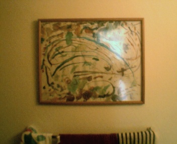 This one is a Mister original. Mister used to like to paint and this was done when he was about 4 years old--give or take a few months. Ok, it's just brush strokes, but the colors aren't bad and he was quite pleased. It's been framed and up for so long it is part of the decor and I could not part with it:
