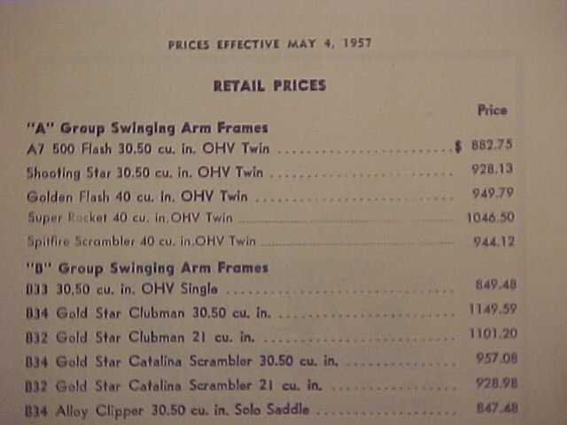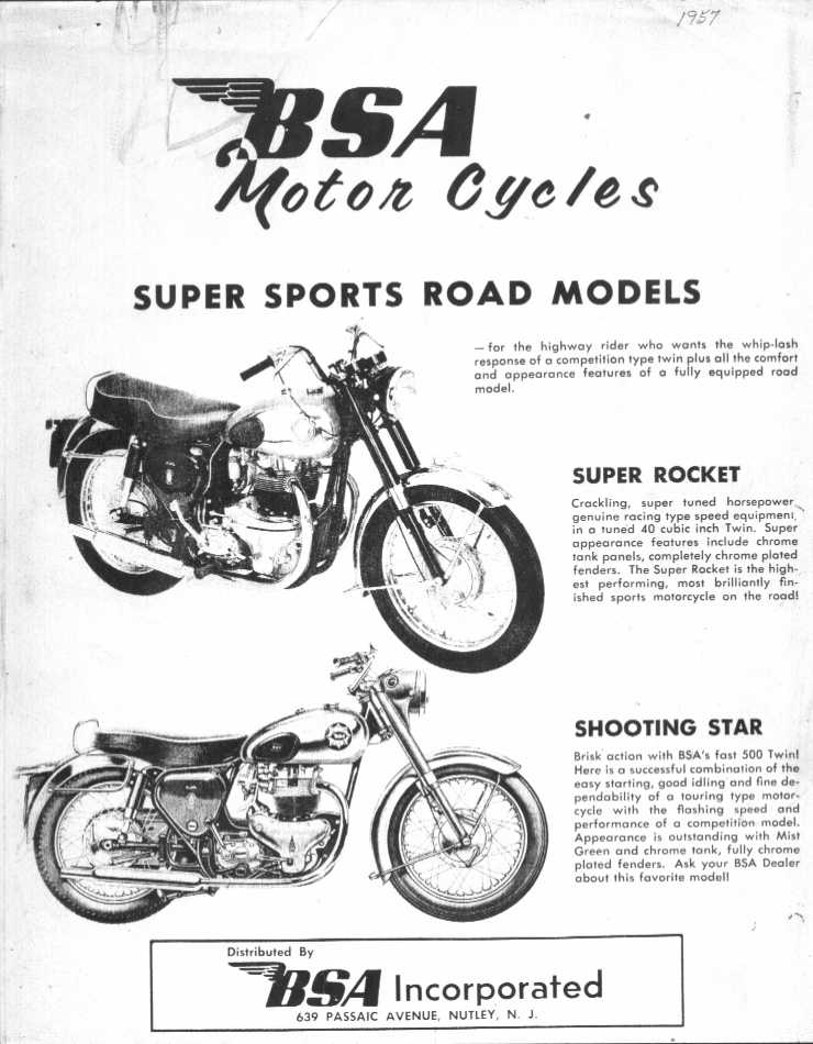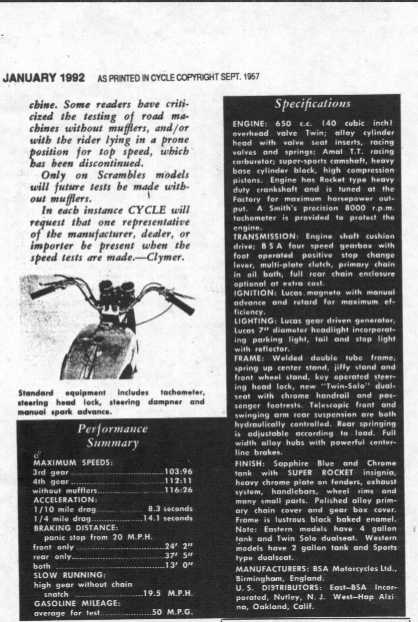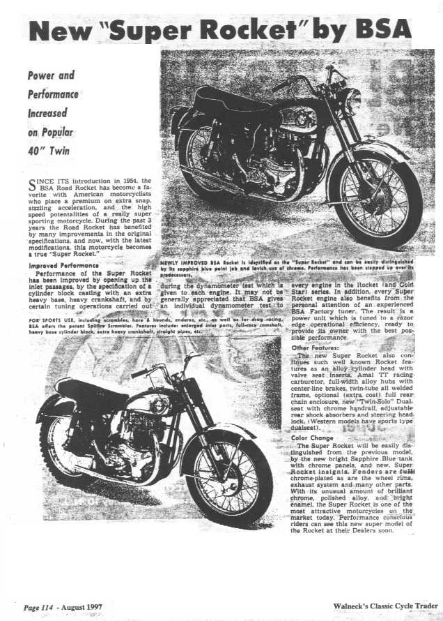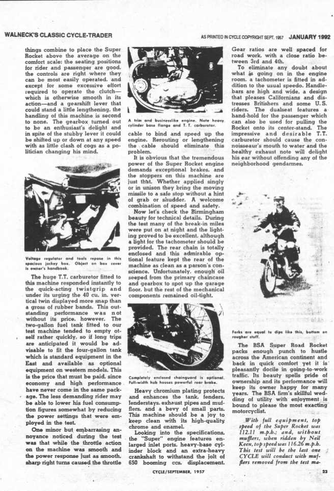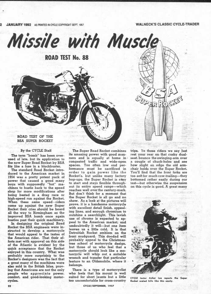 Below is literature I had in my (Daniel Boss) own personal library on 1957 Super Rockets, a reprint that Walnecks did on a 1957 Cycle magazine road test and a sales ad from BSA incorporated in New Jersey.