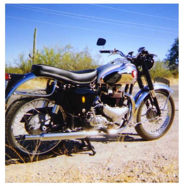 This 1956 A10 Road Rocket is located in Arizona and was purchased from an ad for $300. It was a very rough basketcase, took Bobby about 4 years to find the correct missing parts. The muffler is NOS BSA , Siamese exhaust is Brit. Wassell, Goldstar clubman rear repro. fender, original front fender. Eng# CA10RR-2757 frame# EA710147. 376 monobloc carb instead of 10tt9. Starts and runs good! It came with a Michigan title of 1976, and was run as a scrambler before he got it, no lights, Bobby sends his thanks to Byron Boaz and Lynn Snodgress of Phoenix for their help and expertise.