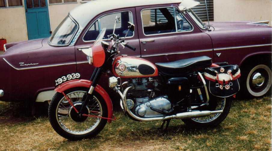 Errol Franks 1958 BSA A10 is a true beauty. Photos 1 and 2 were taken in the summer of 1958 when the bike was about 8 months old. Errol purchased the bike on his 17th birthday in August 1958 it was then 3 months old all the extras you see on it was there on purchase. The bike was sold late 59 never to be seen again. For many years he yearned for the ownership of that bike or one the same. In 1997 as luck would have it he located the bike in photos 3 and 4 and spent the following 3 years under total restoration. The bike is far better than when it came of the assembly line at Small Heath and is a credit to the many artisans that carried out the restoration. Parts for these bikes A10 ,s are not difficult to come by in Aussie as long as you have the cash. The two most difficut parts to come by was the headlight brackets and the gold tank badge. The bike was originally exported from the UK to the US east coast and was exported from the US in approx 1996. The frame and engine numbers are matching. Basically the bike is a 100% export model to Australia and New Zealand. Errol resides in Adelaide, South Australia.