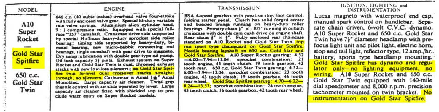 Charles Falco, quoted the 1963 West Coast BSA brochure which has "The Gold Star 650 Twin," which is the 'clubmans' version, as well as the "new for 1963... "BSA Gold Star Spitfire Scrambler." The relevant things from this brochure are that the bike "now has the lightweight Gold Star frame, Gold Star Catalina type brakes front and rear (i.e., the half-width front brake), sports tank..." Charles has the very first Spitfire Scrambler (serial no. 1). The U.S.-only model was made in 1957 with Gold Star Catalina frame and components, then they switched in '58 to using standard A10 parts, and finally in '63 reverted to putting the engine back in a Catalina-type frame (no passenger loops, no lug for a fork lock, etc.). The Gold Star 650 Twin, occupies most of the space in the sales brochure, with only a small spot for the Spitfire, indicating that far fewer of the latter were available for sale.