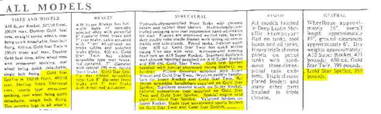 The above two tables are an excerpt of literature sent to me by Don Bachtel with specifications on the Goldstar Twin, I believe it was part of the same sales literature booklet as the page scanned in color at the top of this page. If anyone has a better quality scan of these tables (especially of the 2nd table), please email me a copy.