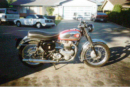 Stans's bike is a 1961 A10 Super Rocket with original frame and engine (manufactured at BSA Feb '61 and shipped to Hap Alzino March 1961). Stan found the bike as a basket case and completely rebuilt it 3 years ago. This Super Rocket has a siameze exhaust sytem, gold star silence, SRM style main bearing conversion (home machined), belt drive to generator (home made), oil pump modified to high output, 1 3/16 - 389 Monobloc, 9.5-1" Italian slipper pistons, rebuilt magneto, SRM style clutch pressure plate (home made), SRM style oil filter (home made), speedo and tachometer rebuilt by Shaw in England, driven every weekend from March to December.