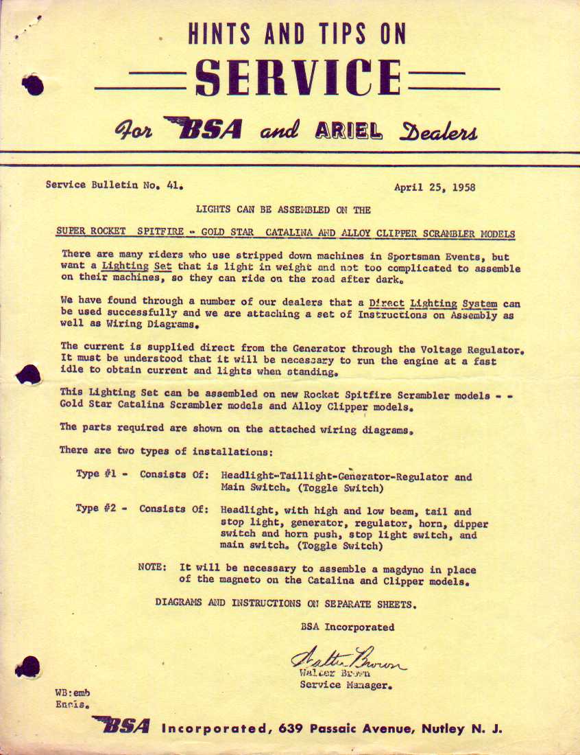BSA Service Bulletin 41 - Direct Lighting Set For Scramblers and Road Models