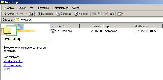 Una vez descargado , comenzamos con los pasos a seguir para la instalación del BVE . Lo primero que tienes que hacer es localizar el fichero que hemos descargado , para ello te puedes ayudar con el Explorador de archivos de windows . En el caso que hayas descargado el fichero en el directorio "bvesetup" aparecerá algo semejante a lo siguiente.