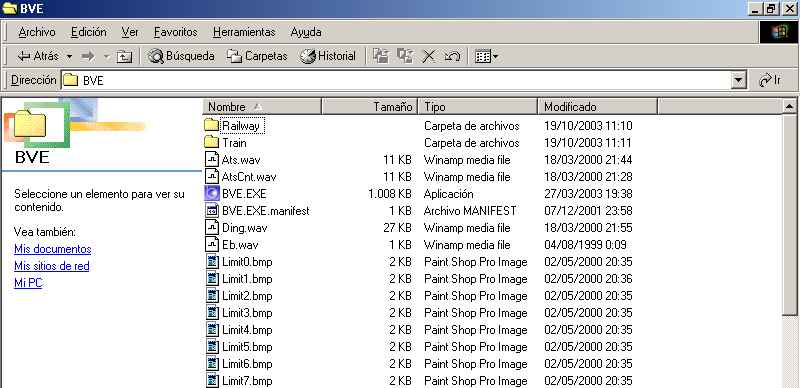 GUIA INSTALACIÓN DE RUTAS Y TRENES Esta guía ha sido actualizada para ser utilizada con la versión 2.5.X del simulador BVE . El simulador BVE , en la instalación del programa , únicamente instala los archivos necesarios para su funcionamiento , sin embargo en la instalación no se incluye por defecto ninguna ruta ni tren que podamos utilizar , por ello es necesario instalar las rutas y los trenes aparte para poder utilizar el juego , y así poner en marchar nuestras emociones conduciendo un tren por cualquier parte del mundo , tocando el silbato del tren anunciando nuestra llegada a la estación ... Lo primero que hay que saber para instalar una ruta o un tren , es saber en que directorio hemos instalado el juego . Normalmente el juego se instalará por defecto en c:\ archivos de programa\BVE , aunque como es lógico lo habreis podido instalar en cualquier otro directorio que hayais elegido . Nosotros trabajaremos con el directorio que viene por defecto , y así nos ayudará en nuesta explicación . Para encontrar la localización del directorio del juego , podemos utilizar la aplicación del EXPLORADOR DE WINDOWS . Una vez con el explorador abierto , nos iremos desplazando entre los diferente directorios de nuestro disco , buscando el directorio c:\ archivos de programa y luego el diectorio BVE . Localizado el mismo haremos un click en el directorio BVE y nos aparecerá algo similar a lo siguiente .