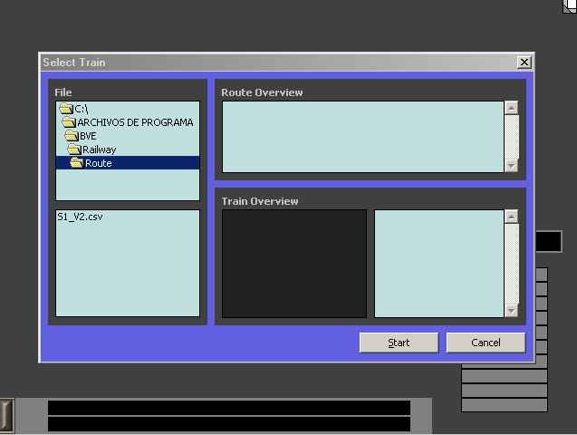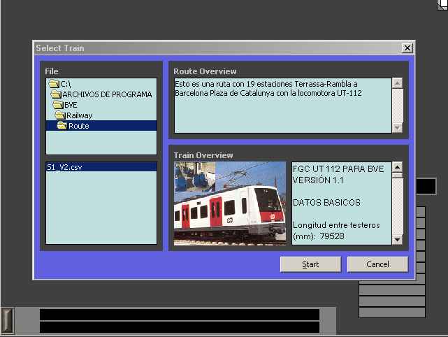 Esto que aparece es la información , primero de la ruta que vamos a utilizar y despues la del tren , con sus características. NOTA IMPORTANTE: es importante saber que si quisieras utilizar un tren diferente para esta ruta en concreto , con el programa BVE no podríamos hacerlo por el momento, a no ser que editaramos el fichero de la ruta y cambiaramos las opciones (pero esto lo dejo para una próxima guía ) . Tambien si consultas la sección de utilidades podras encontrar un programa adicional que permite realizar esta operación de selección de trenes .
