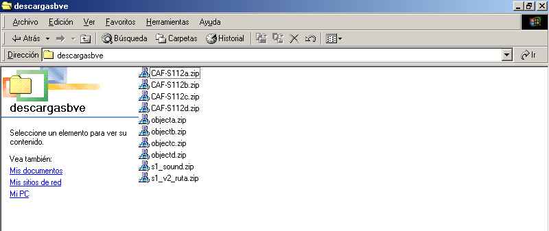 Aquí podemos observar los diferentes ficheros que se han copiado durante la instalación del juego . Una vez localizado este directorio , es conveniente saber que la instalación de una ruta esta formada por 4 elementos : objetos , fichero de la ruta , sonido de la ruta , y fichero de instalacion del tren. Ahora lo que vamos a hacer es bajarnos estos elementos , como ya dije para este ejemplo de instalación utilizaremos la ruta de la linea S1 que podreis encontrar en mi página . Este ejemplo de instalación es aplicable a cualquier instalación de una ruta y tren distitno que se pudiera encontrar en otra página , lo único que puede variar es la forma en que tengamos que bajar los archivos , ya que pueden venir comprimidos de manera distinta o compilados todos los archivos en uno solo . Bien pues comencemos la descarga de archivos , primero nos vamos a la sección de rutas de mi página y descargaremos los tres elemenos principales de una ruta (fichero de ruta, objetos y sonido de la ruta) , tened en cuenta que debereis bajaros los cuatro archivos de los objetos . Estos archivos es recomendable copiarlos en un directorio nuevo que hayais creado por ejemplo c:\descargasbve . Una vez bajados los archivos , procederemos a bajar el tren que utiliza esta ruta , que es la UT-112 , paraz ello nos vamos a la sección de trenes de mi página. Una vez dentro procederemos a bajar los 4 archivos correspondientes del tren , estos archivos tambien los copiaremos en el mismo directorio que hemos creado c:\descargasbve . Si hemos seguido bien estos pasos , utilizando el explorador de windows y abriendo la carpeta c:\ descargasbve , tendremos que tener algo semejante a lo siguiente.