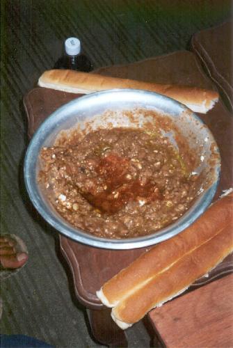 Many new vistors make the mistake og eating it plain, in which case it's no wonder they don't like it! The proper way to eat it is to mix it up with an assortment of salad, tomatoes, onions,strong 'jibna' cheese (like fata), salad and 'shotta' fiery chilli power. Drawn it a bit in oil and it's then eating by scooping it up in some bread. like most food in Sudan, fuul is eaten communally from one bowl_ the more people at the table, the bigger the bowl and the more fingers the merrier! you'd be a fuul not to try it! (sorry couldn't resist that one!) |