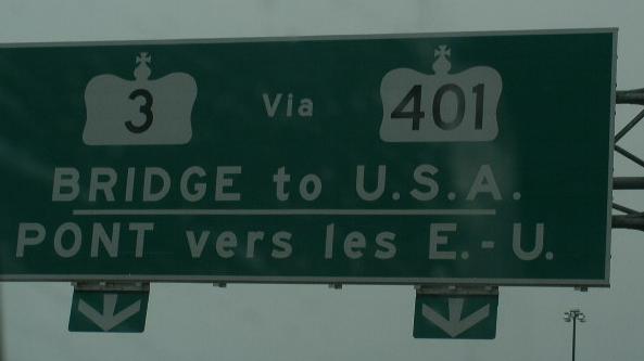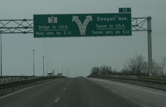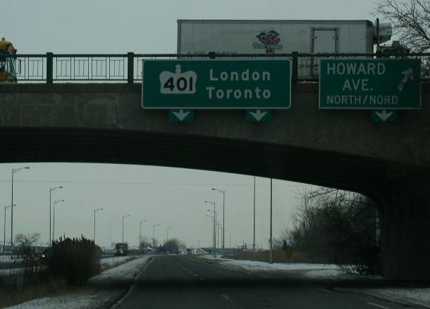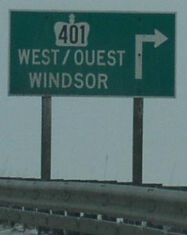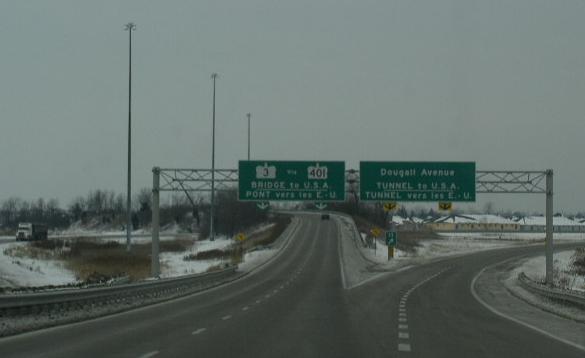 WB ON KH 401 at the split for traffic heading to the tunnel or bridge to the U.S.A.