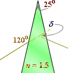 | 一束光線進入一三棱鏡, 其入射角為 i. 若三棱鏡棱角為 α, 折射率為 n, 求光線出來時的折射角 r 及偏角 δ. | ![]() 如圖, 光線由左邊進入折射率為 1.5 的棱鏡, 又在右面出來, 其偏折的角度為 δ. 若光線與棱鏡表面形成 120° 的夾角, 求 δ. (實際上光線入射角為 120° – 90° = 30°) |