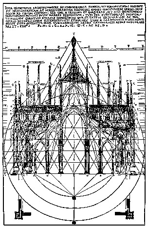 Harmonization of the proportions of the cathedral of Milan by Stornalocho architect in 1391 with the use of triangles and presented, with the added one of circles, by Cesare Cesariano in 1591 in its translation and commentary of the work of Vitruvio. In 1931 Ernst Moessel it used that base to propose a thesis that interprets the design of Stornalocho. Nevertheless, the work of Moessel only considers external equilateral triangles and not both inner isosceles triangles. Indeed the greater one of these is a Golden Triangle complete and the interior its half. The design spread by Cesariano appears without no intervention and in the copy of its central part with the presence of those two triangular figures.