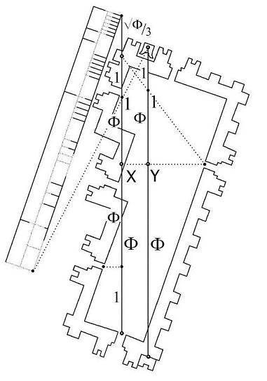 Se encontró tres vértices de ángulos cuyos lados y bisectrices que, con alineaciones a puntos de referencia en el plano y en la regla, definen con precisión la localización de los puntos extremos de dos líneas maestras paralelas entre sí. Cada una de éstas líneas muestra por separado valores de F. La relación y posición de esos valores señalan con absoluta claridad la intención de exponer las proporciones humanas. |