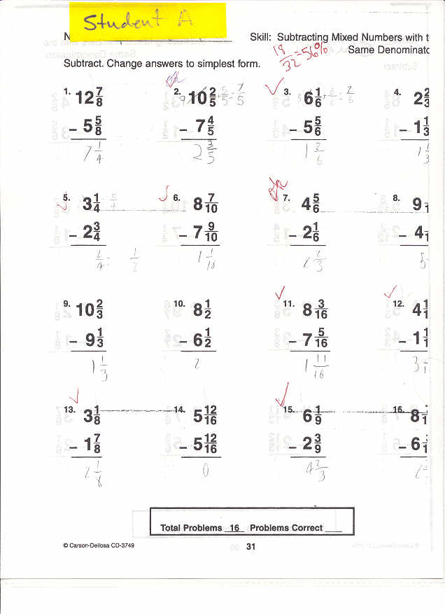 Student A, seemed to do well when he showed his work, he only missed one problem when he showed his work, but he did not change the answer to simplest form. When there was regrouping involved and the student did not show his work he missed each problem. If it was simple subtraction he did not miss the problem.