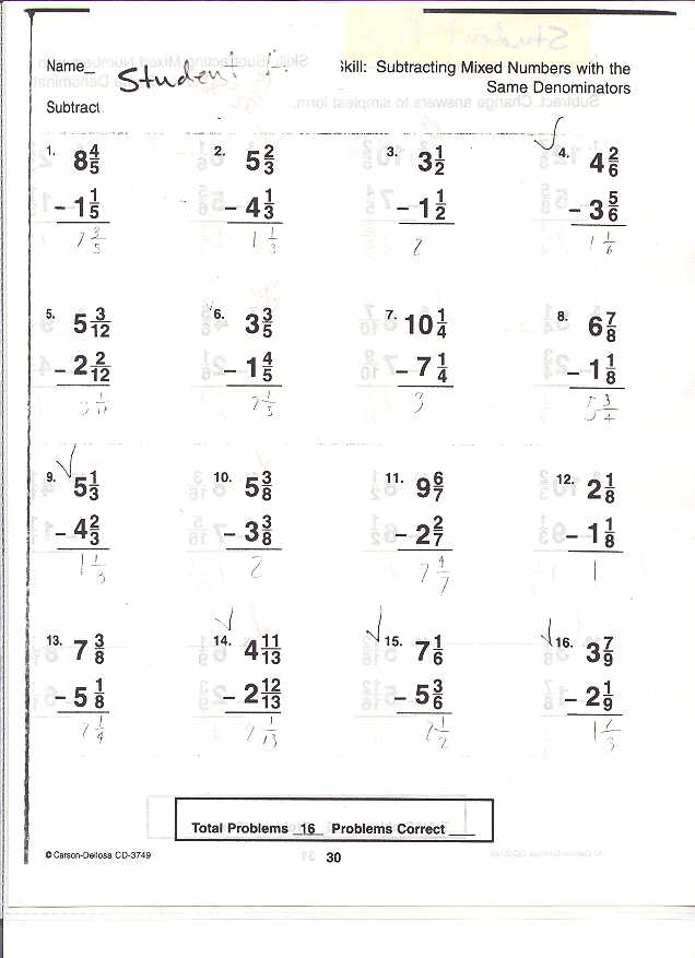 Student Evaluation of Students in Lesson Subtracting Mixed Numbers with the Same Denominators using Regrouping.
