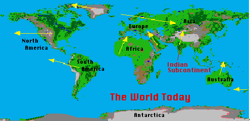 Notice the position of the Indian Subcontinent today. It moved hundreds of miles in 135 million years at a great speed (4 inches per year!!!) The Indian plate crashed into the Eurasian plate with such speed and force that it created the tallest mountain range on Earth, the Himalayas! What do you predict the world will look like in 100 million or 200 million years? What new mountain ranges will form? Where will new volcanoes erupt? Go to the "Next" button to see what may happen to the Earth' continents. |