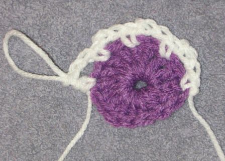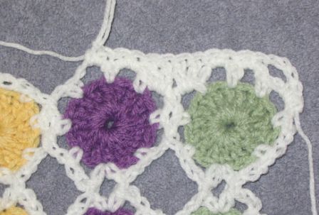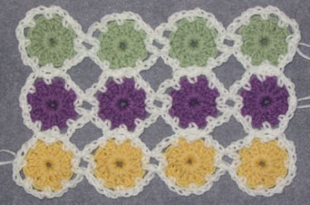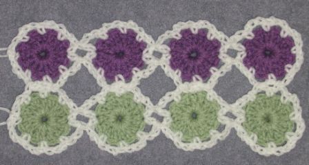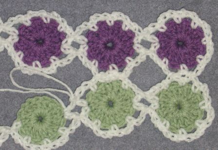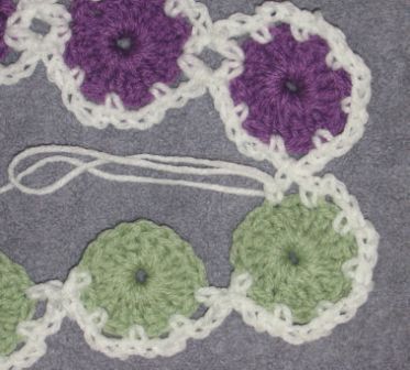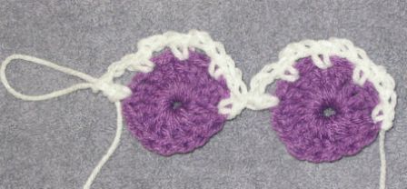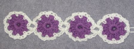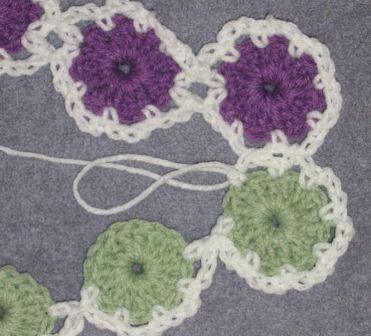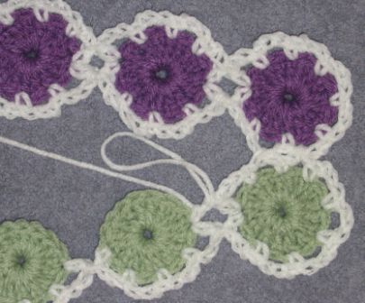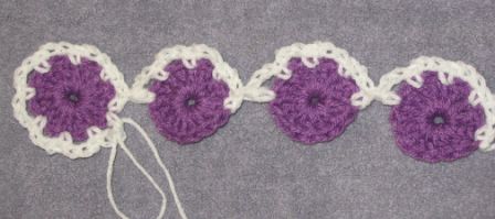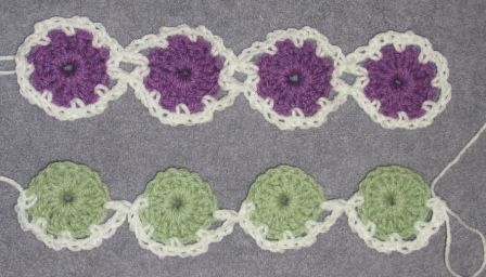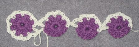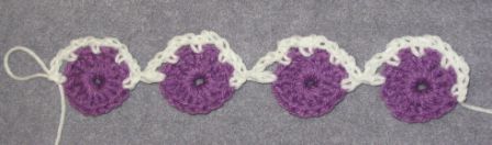 Okay, now we're ready to add the next row of yoyos. This is only a tiny bit more complicated than the first row. If you've done the Flat Braid Joining method for joining afghan squares, this will be very simple for you.
