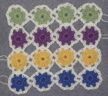Repeat Row 2 joining for rows 3 and 4. You may notice that my loose ends are on the left for two of the rows and on the right for two of the rows. I chose to join two rows and then flip them around and join the other two rows on the opposite side. I did this to "spread out" the end weaving later on. This way, there are four ends to weave on each side, reducing the chance of making the edges bulky and ugly.
