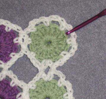 Here's a cool way to join them which minimizes extra ends to weave. Be sure to scroll down to the bottom of the page for a photo of a huge afghan made using this technique. I based this joining on Priscilla Hewitt's Flat Braid Joining method. I love the look of her yoyo joining, but wasn't crazy about the idea of using a separate strand to join each individual yoyo. I came up with this method as a way to join as many yoyos as you want in one row with a single strand of yarn. In the case of my giant afghan pictured below, this means that I had only 50 ends to weave for the joining instead of 1500!