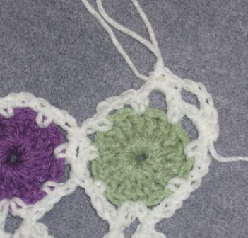 Ch 2, sk next st, sc in next st. # Ch 1, drop loop from hook, insert hook through loop of second yoyo of previous row (see photo for placement). Put loop back on hook, ch 1, sk next st on current yoyo, sc in next st. Repeat from # once. You should now have two ch spaces of the current yoyo joined to two ch spaces of the second yoyo in the previous row.