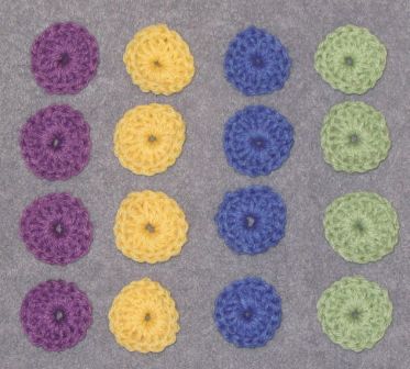 Chain 4, join with sl st to form ring. Ch 3, 15 dc in ring. Finish off. Be sure to weave ends securely. Decide how you would like to arrange your yoyos in four rows.