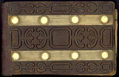 de tapas de cuero marrón rojizo repujado con decoración floral