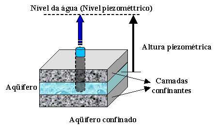 Quando um poço é perfurado através da camada superior confinante atingindo o aqüífero, a altura da água no poço representa a pressão a que se encontra submetida a água no aqüífero. A pressão hidrostática em determinado ponto do aqüífero, expressa em metros de água, é igual à distância vertical desse ponto àquele nível.