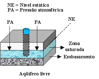 Na superfície do lençol a água nos poros do aqüífero encontra-se sob pressão atmosférica como se estivesse em um reservatório ao ar livre,e nessas condições o aqüífero é denominado de lençol de superfície livre , lençol freático ou aqüífero livre . A pressão hidráulica em determinado ponto do lençol freático é igual a sua profundidade, medida da superfície livre até o ponto em questão, podendo ser expressa pela coluna de água ou pressão hidrostática, em metros.