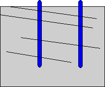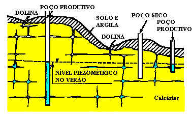 (Esquema de um aqüífero cárstico mostrando as "fendas" originadas por dissolução do calcário - durante períodos de recarga da água subterrânea, poços anteriormente secos podem se tornar produtivos pela elevação do nível da água no aqüífero; por outro lado, poços construídos durante os períodos de recarga podem se tornar improdutivos nas épocas de verão se não se conhecem os níveis de flutuação do nível da água)