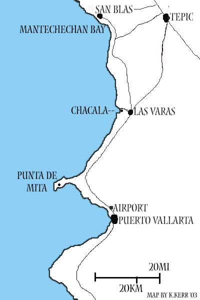 | Nayarit Coast On the airplane on my way home, I had an excellent view of the coastline, and even saw the tiny bay of Chacala. Punta de Mita is the landform just north of Puerto Vallarta, this map I drew shows the coastline, and how the upper coastline faces slightly northwards, for pacific ocean actions, and more waves. Which to me means cleaner, more agitated, aerated waters...this particular coastal area is excellent for many reasons especially surfing, and swimming in cleaner unpolluted waters.........................A fellow traveler emailed me with this link to his webpage about CHACALA, he has a lot more info and lots more pictures, have a look.-K......http://members.shaw.ca/Chacala-Sayulita/Chacala.htm | |||||