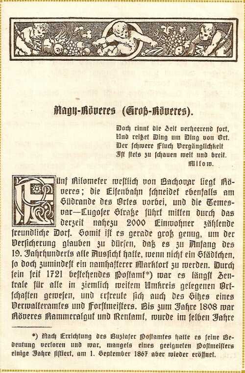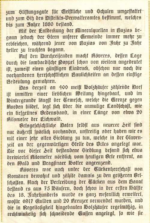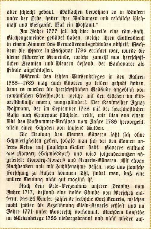 "Keveres în Banat, 1 3/4 mile de Timișoara. Este mare dar prost construit. Valahii îl locuiesc în case sub pamânt, au pădurile lor și turme bogate de vite, pe care le cresc și le îngrașă. Are o stație de poștă"