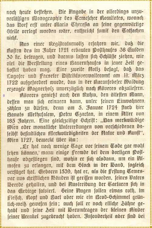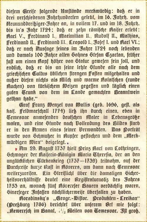"Pâna cu câteva zile înaintea morții sale a putut fi văzut, sănătos, în fața stației de poștă, sprijindu-se într-un baston, așteptând pomană din partea călatorilor care coborau din poștalion. S-a născut în 1539, iar la răpirea cetații Timișoara din mâinile creștinilor [6], pe când păstorea vitele tatălui său, s-a refugiat din fața năvălirii cetelor de tătari, în munți. Spre sfârșitul vieții avea ochii înroșiți, iar culoarea feței îi era precum cea a mucegaiului de pe pâine, verzui deschis; în gură mai păstra câțiva dinți și își petrecea vremea având grijă de copilașii unui strănepot.